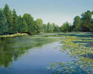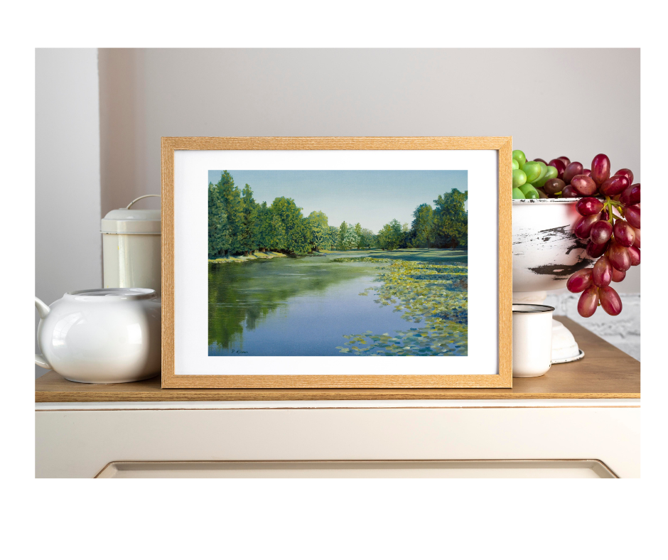 "Waterlilies at Turtle Creek" is a fine art print of an original landscape oil painting, by artist Pat Klamm.  This high-quality giclee print is created using pigment-based ink on Somerset Velvet paper, that helps reduce the chance of print fade over time per the manufacturer. Somerset Velvet paper is a 100% cotton rag paper, offering a unique museum-quality feel.